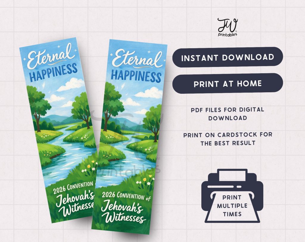 Celebrate the 2026 Convention of Jehovah’s Witnesses with this “Eternal Happiness” themed bookmark.