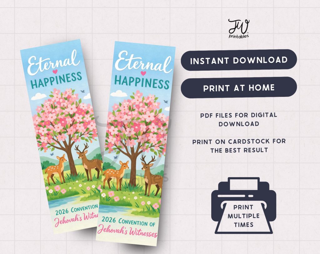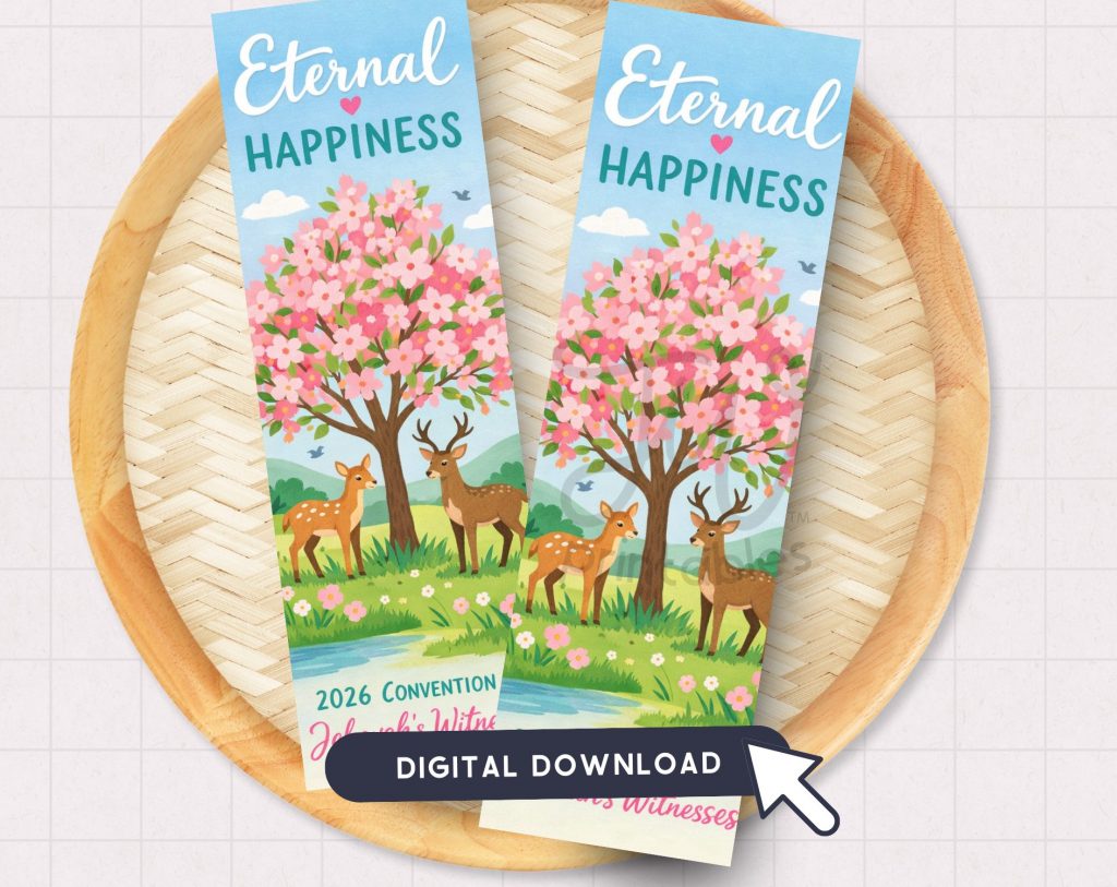 Celebrate the 2026 Convention of Jehovah’s Witnesses with this “Eternal Happiness” themed bookmark.