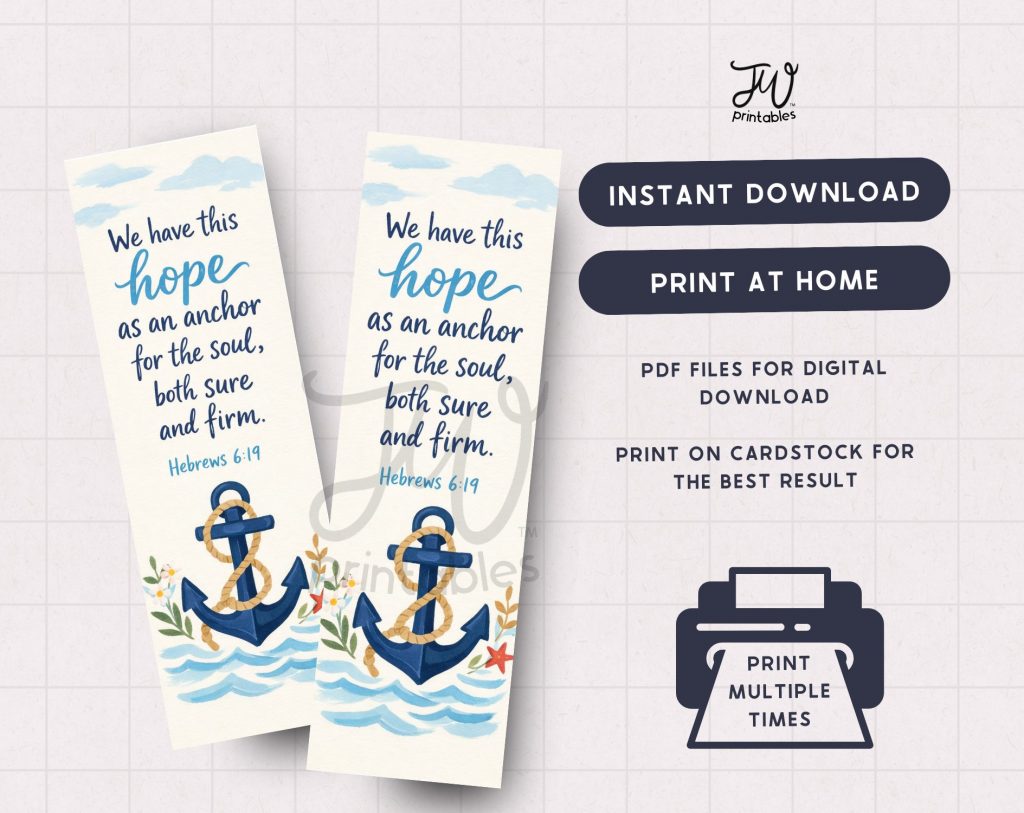 Stay anchored in faith with this encouraging bookmark featuring Hebrews 6:19 “We have this hope as an anchor for the soul, both sure and firm” with a peaceful watercolor nautical anchor design.