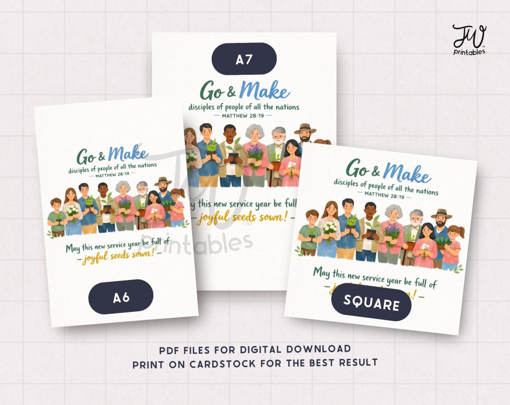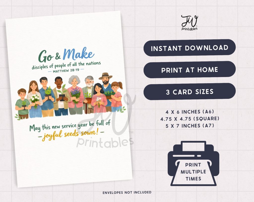 Celebrate the new service year with this encouraging greeting card featuring “Go and Make Disciples” from Matthew 28:19 with diverse publishers in the ministry and a heartfelt message about sowing joyful seeds.