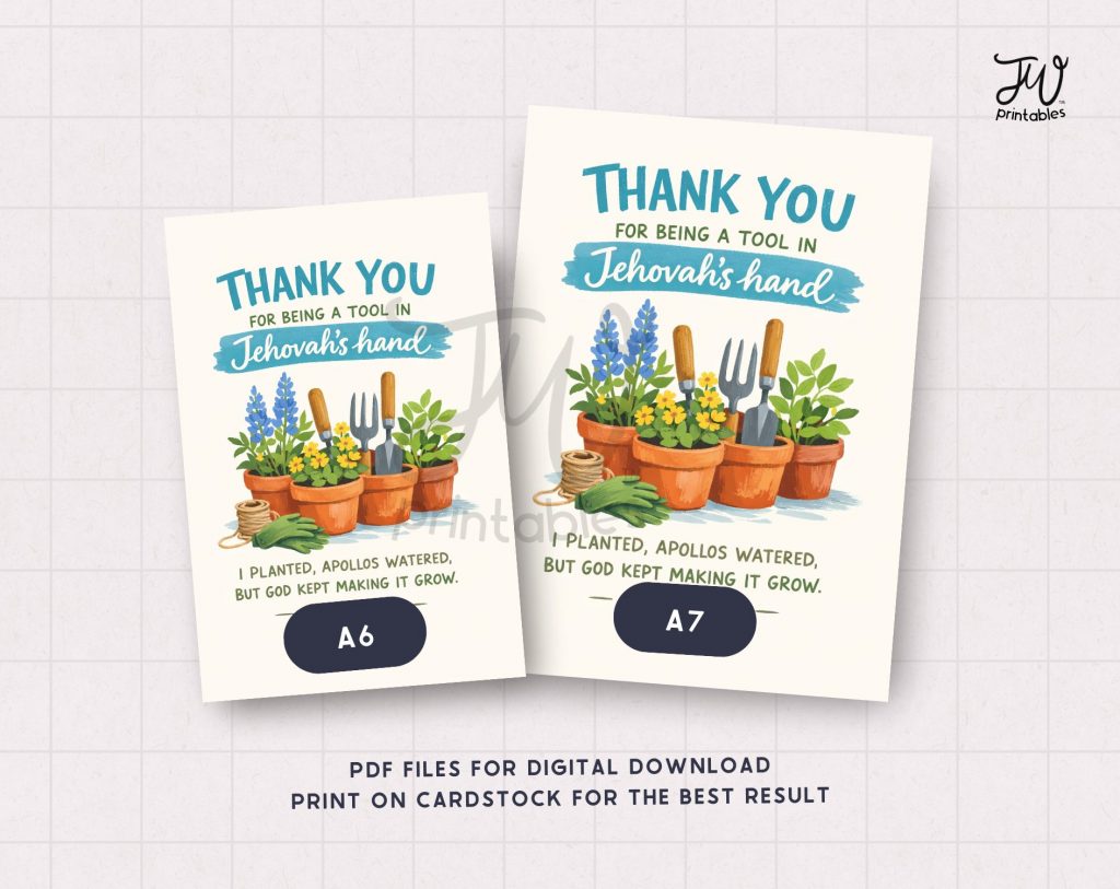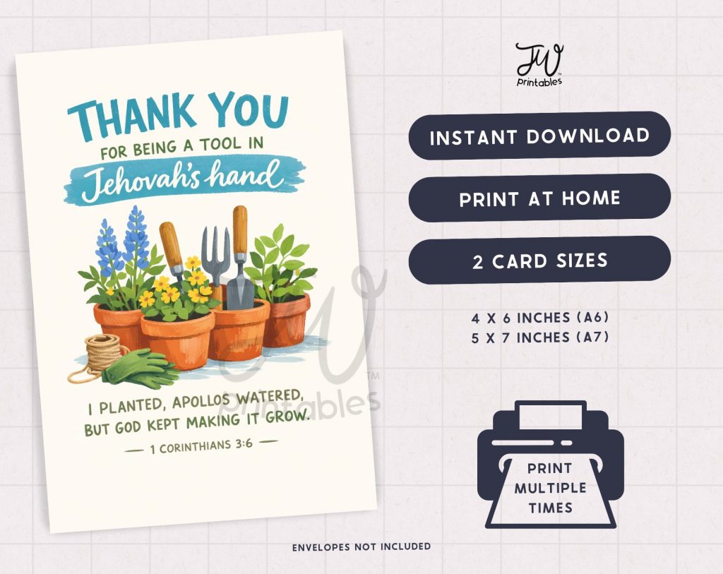 Show appreciation to faithful volunteers and workers with this heartfelt greeting card featuring the encouraging message “Thank you for being a tool in Jehovah’s hand” with 1 Corinthians 3:6 and beautiful watercolor gardening design.