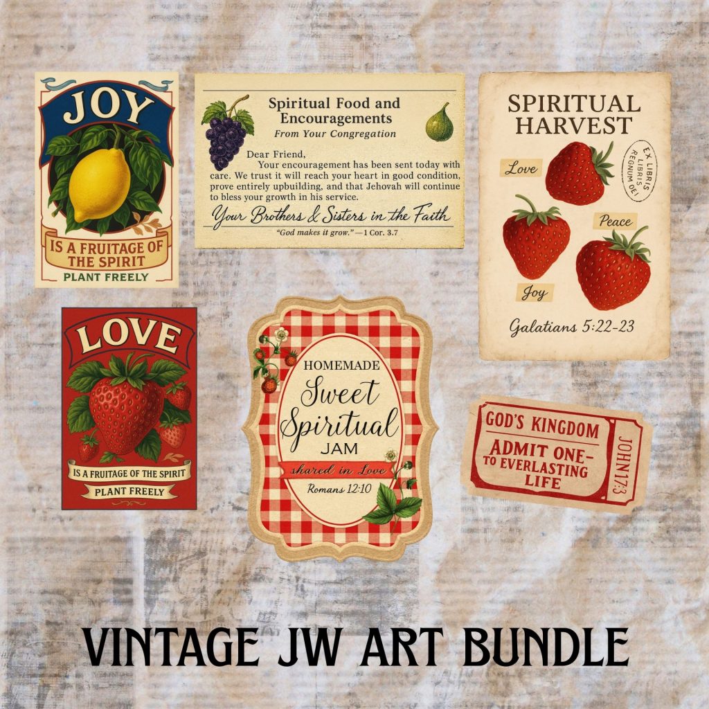 Vintage-style JW art bundle. Printable set with encouraging designs you can use for cards, gifts, or spiritual projects. Includes classic fruit-label looks with scriptures and phrases like “Spiritual Harvest” and “Sweet Spiritual Jam.” Great for letters, pioneer gifts, notebooks, or scrapbooks. Print and cut at home for easy, meaningful scrapbooking or decor.